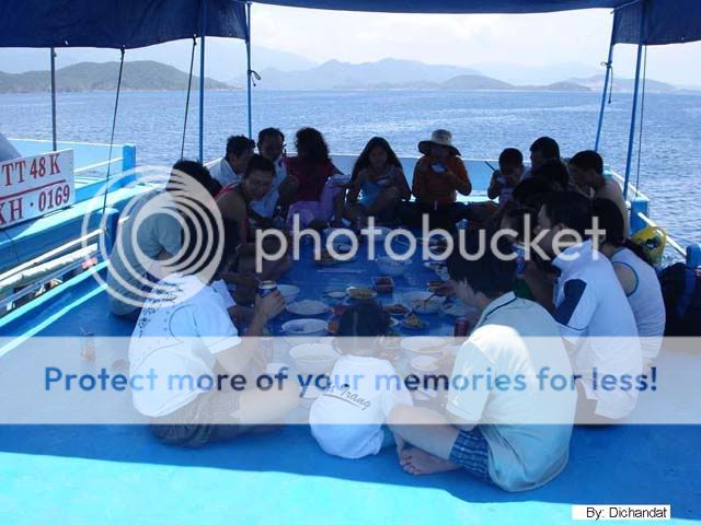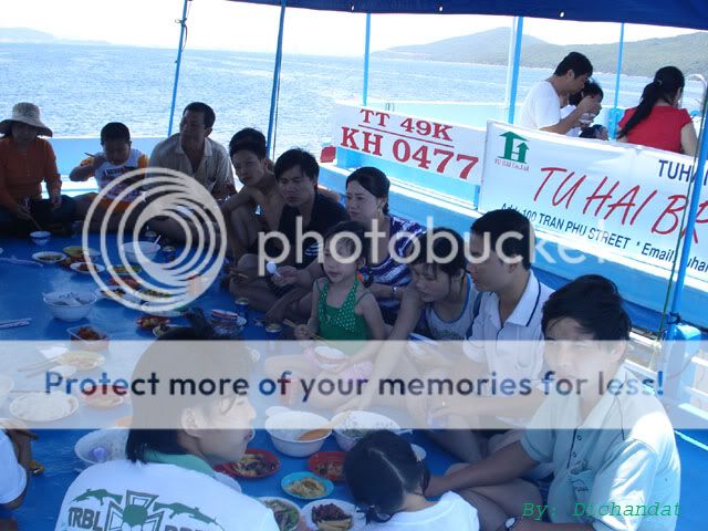 Tựa của ghế ngồi lúc này được ngả ra biến thành một chiếc bàn lớn, bạt trên nóc tàu lúc trước cuốn lại cho khỏi gió, bây giờ được căng ra như một chiếc lều. Như vậy là mỗi tàu sẽ có hai bàn ăn, một dưới khoang và một trên nóc. Đoàn của chúng tôi được ngồi trên nóc cùng với đoàn của Gia Lai. Gió lồng lộng thổi, biển xanh ngắt, nắng chói chang, nhưng ai cũng lấy làm thích thú khi được ăn một bữa cơm lênh đênh giữa biển nhưng lại đông vui như thế này. Các đoàn chẳng biết nhau, nhưng khi ngồi chung một con tàu suốt cả buổi sáng, chơi với nhau, khám phá với nhau, cùng nhau chiêm ngưỡng thiên nhiên cho nên họ gần như xích lại với nhau hơn. Bây giờ lại chung một mâm cơm với vị trí độc đáo và những món ăn mà theo như lời của các nhân viên phục vụ thì “chỉ có ở Tứ Hải của Nha Trang mới có”. Nào là Bạch tuộc xào Thơm, nào là cá Ngừ đại dương kho rim, nào là canh Thuồng luồng v.v. nghe có vẻ hấp dẫn lắm.